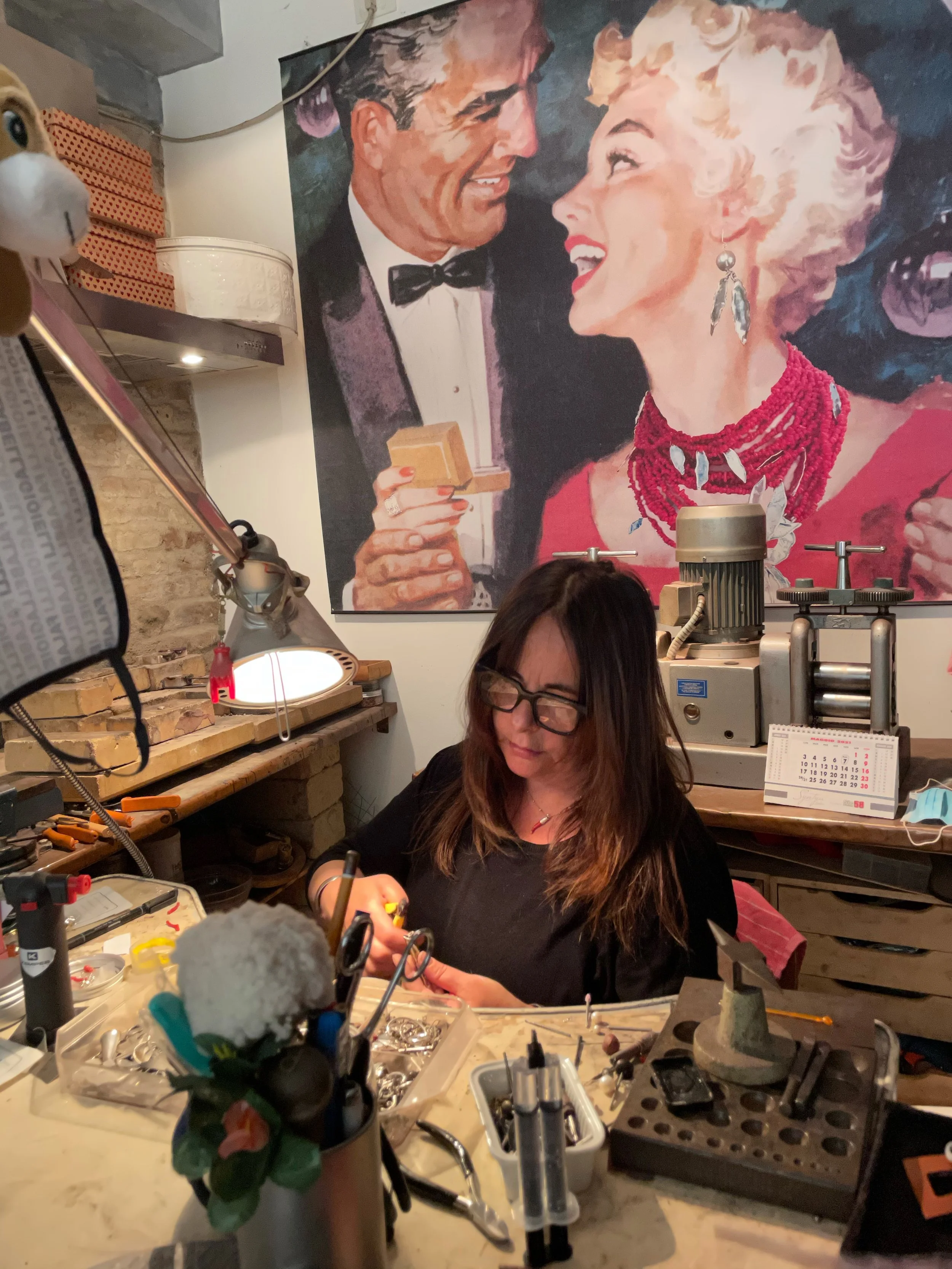 Giusi nel 2010 vede la sua vita altrove. Ricomincio da me. Sento di nuovo questo lavoro tutto mio e realizzo i miei gioielli nella nuova “Bottega“ come amo chiamare il mio atelier in Via del Seminario nel cuore della città di Pesaro.